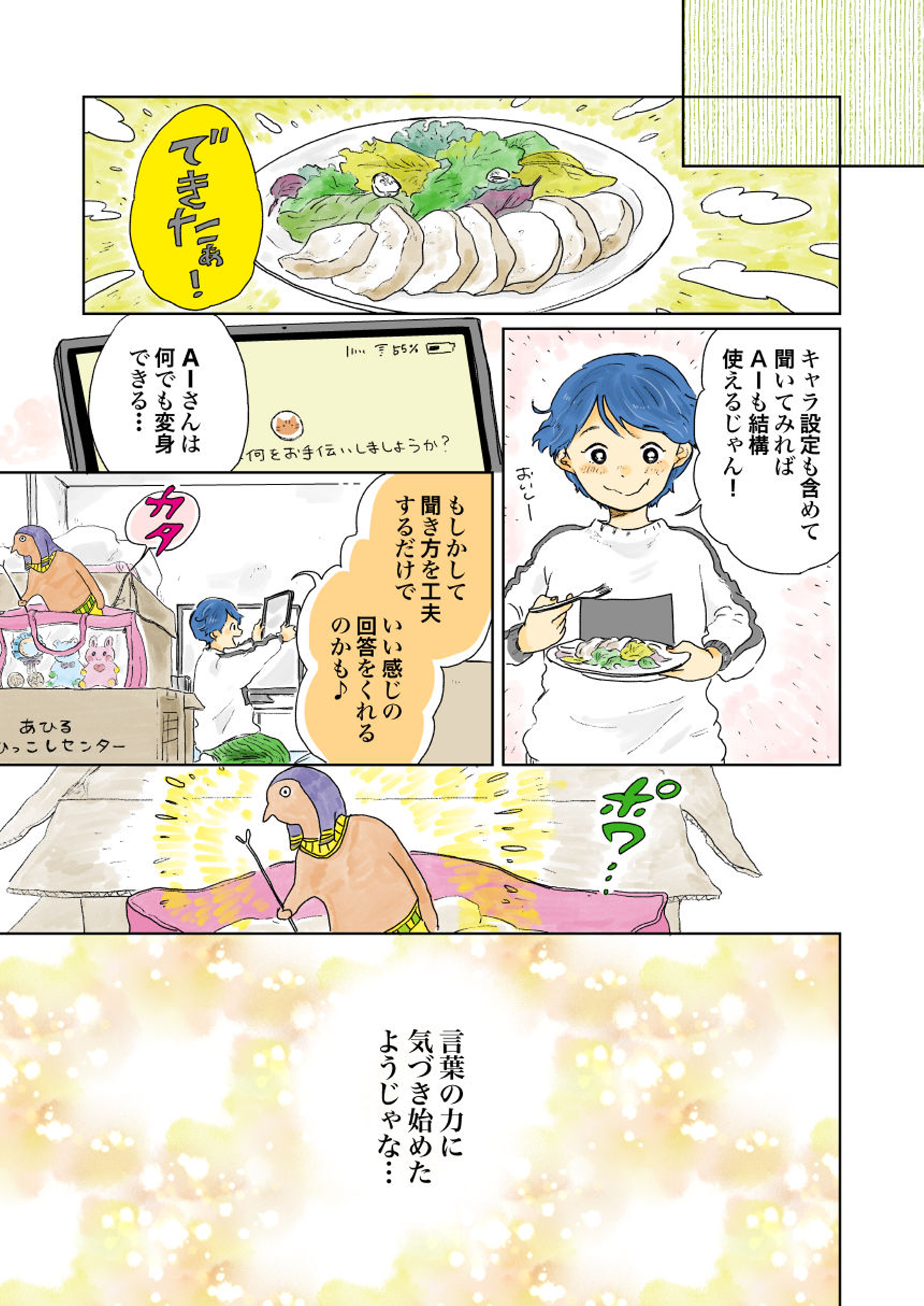 AIへの入力となるプロンプトは工夫次第で結果が大きく変わっていく。プロンプトでより詳しい内容を指定すればそれに準じた回答になっていくはずじゃ。まるで魔法の呪文みたいじゃろ?一度ですべての人物像を説明せずとも周りの状況などの補足を順次行っていく事もできるぞ。今の流行りはチャット形式じゃからのぉ。
