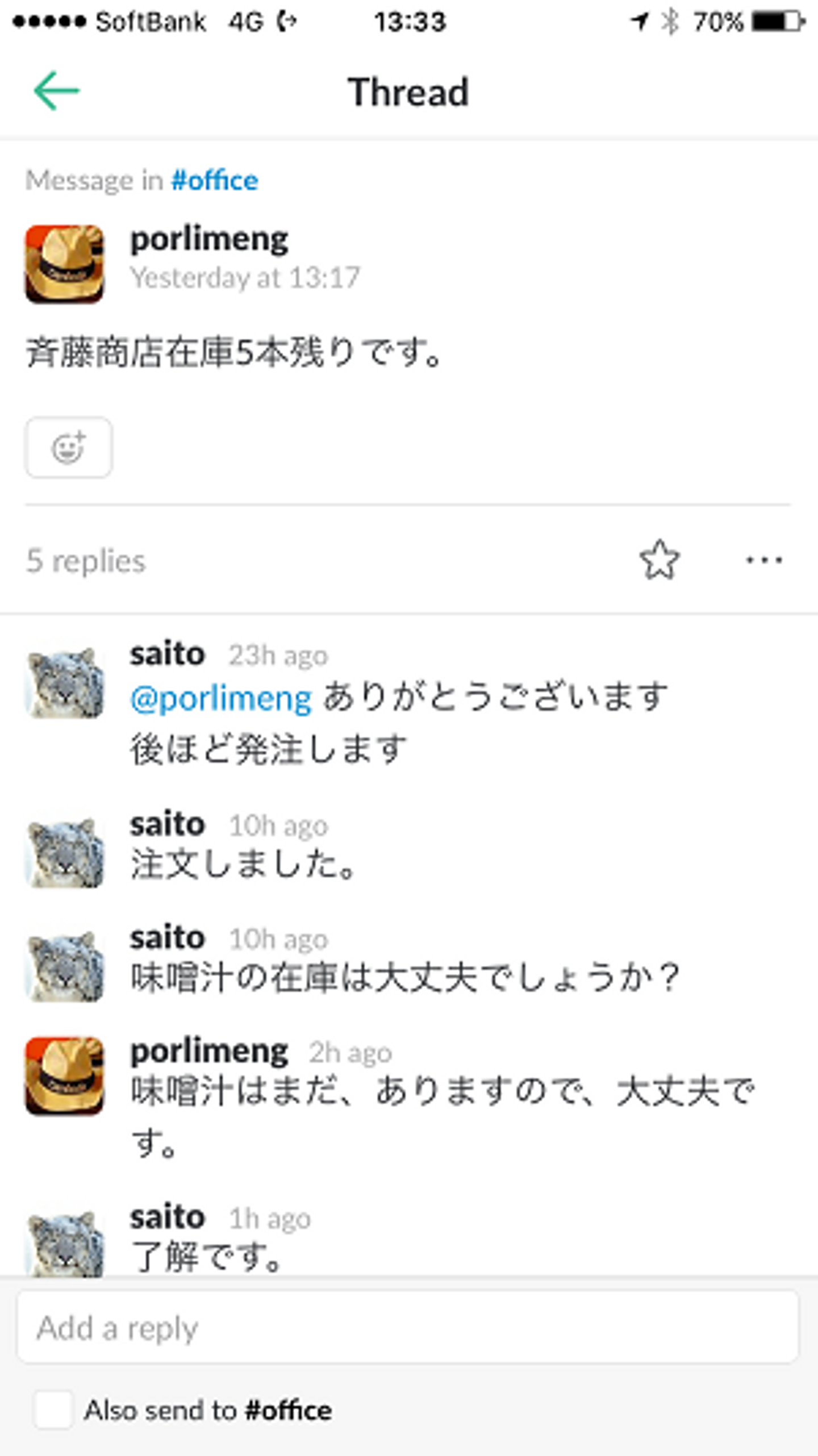はしょって説明すると、saito(社員)は社内業務や数々の無茶ぶりプロジェクトでがんばっているメンバーのために飲み物(主にエナジードリンク)等を仕入れる役割を自らかって出てくれているのですが、その在庫がなくなりそうになった時、気づいた社内のメンバーが善意で店長に連絡するといった 心温まるストーリです。