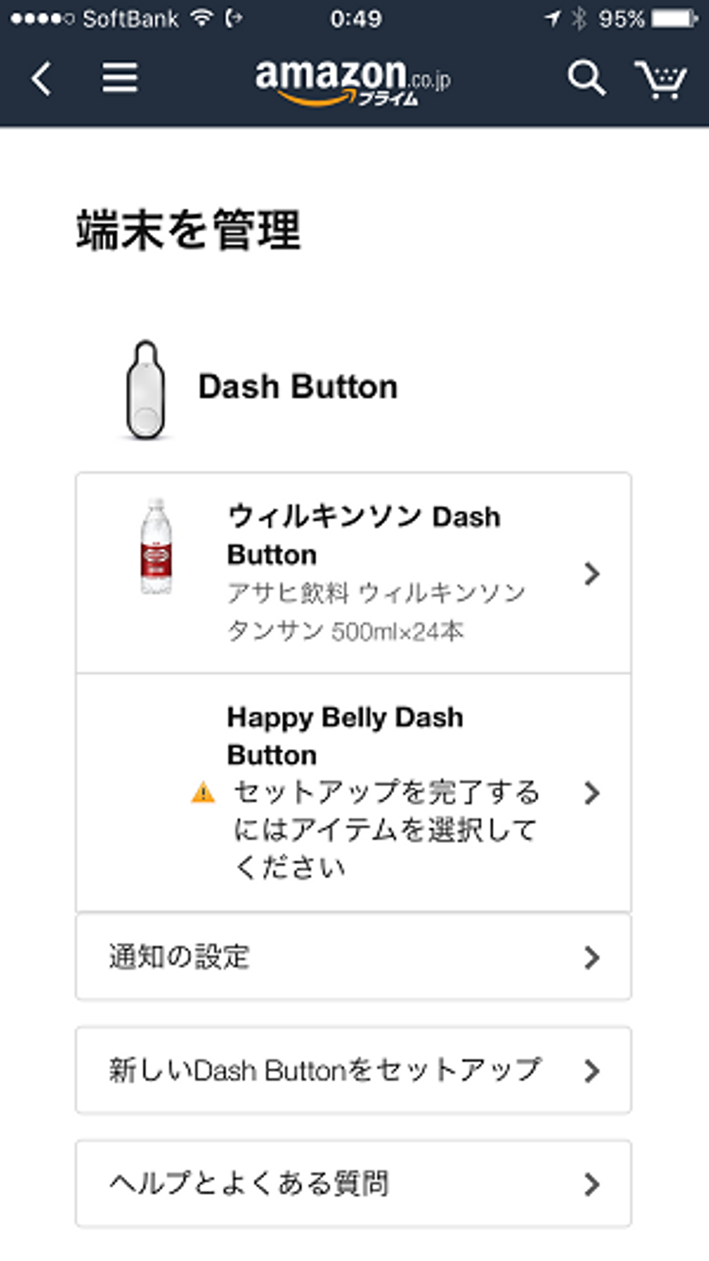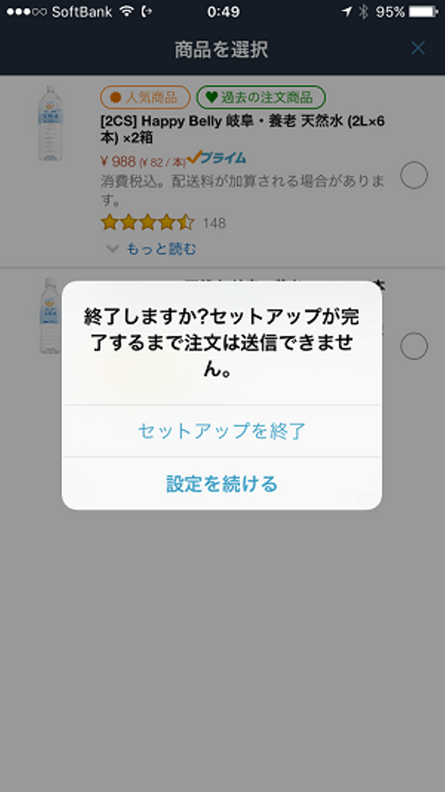 ※amazon dashボタンからの最初の注文だけdashボタン代500円が値引きされるので、この手順の前に、そんなに今は必要ではないかもしれない水を注文しています。一度注文した後でもボタンは初期化できるのでご心配なく。