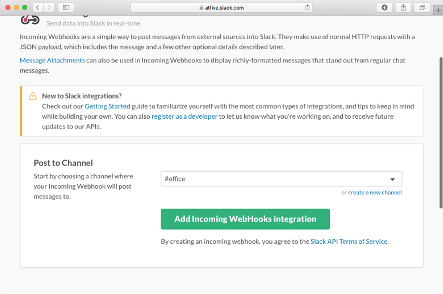 Add Incoming WebHooks integrationをクリックするとURLが表示されるので、控えておきます。