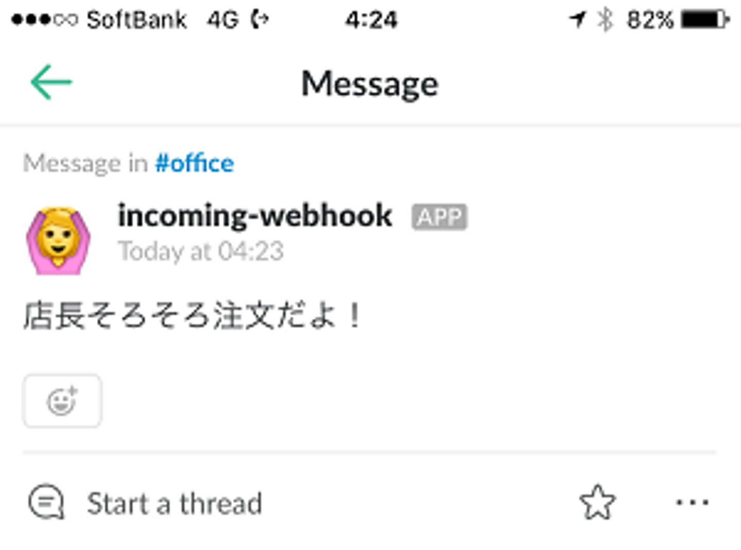 "body": {"icon_emoji": ":ok_woman:", "text":"店長そろそろ注文だよ!"}