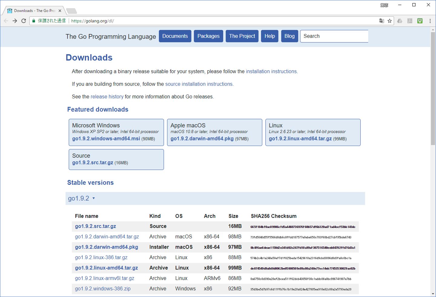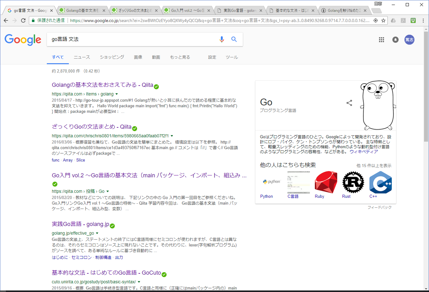 「Go言語 インストール」などで検索すると環境構築の記事は幾らでも出てくるので、それを参考に本家からWindows版をダウンロードしインストールします。