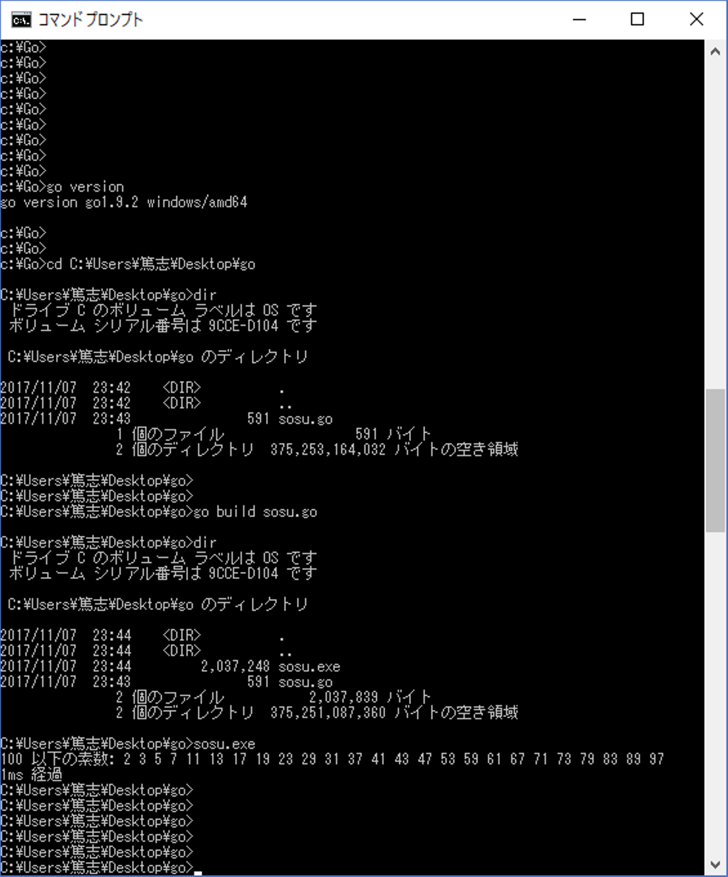 最近のインストーラは良く出来ているので、もういきなり使える状態になっています。コマンドプロンプトでgo versionが動くことを確認したら、ついでにHello Worldくらいまでサラッと試してみます。