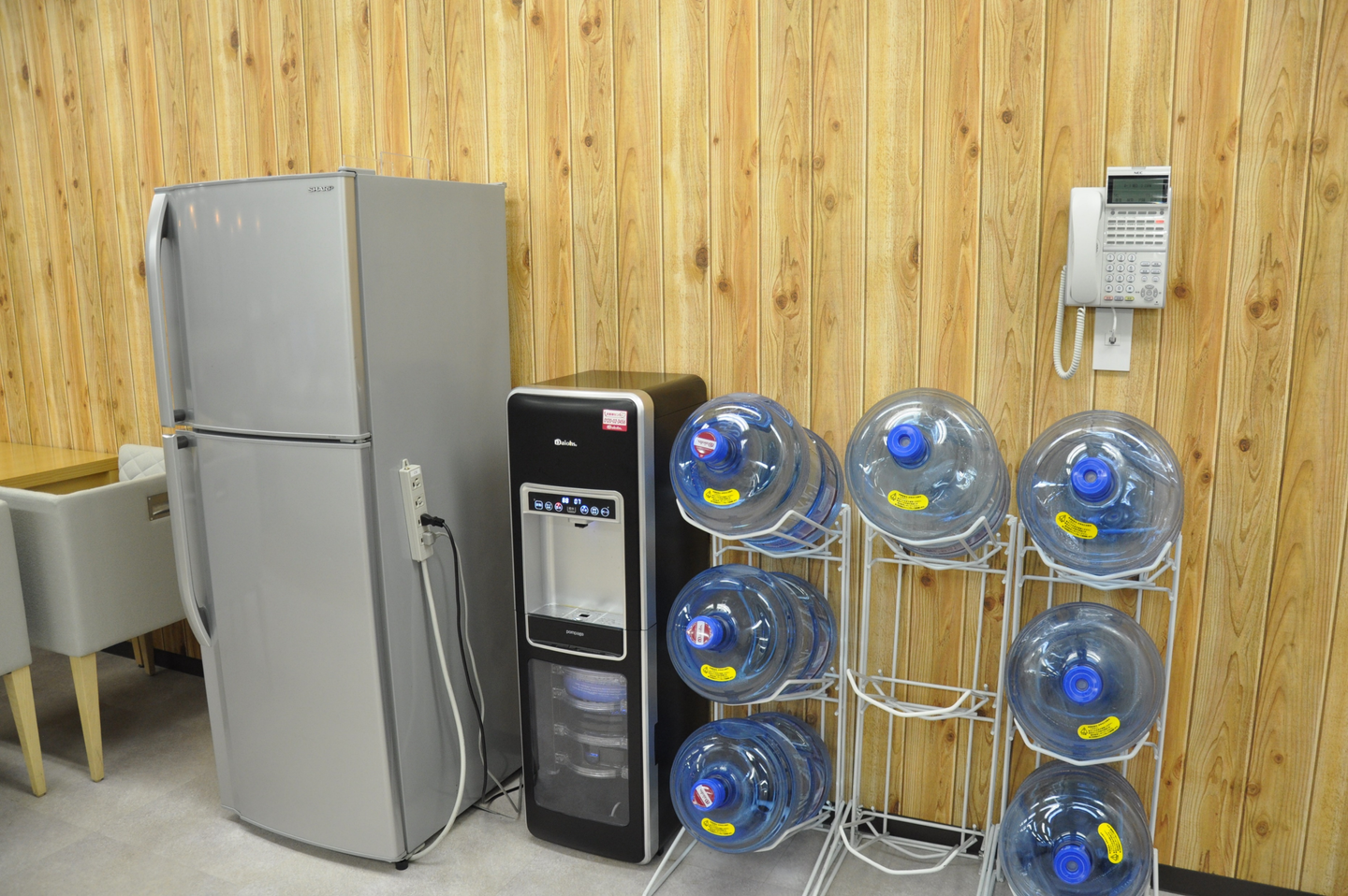 食事の場や、ちょっと一息の場として使われるスペース。 ウォーターサーバーや冷蔵庫、電子レンジ、ポットなどが完備されています。 ソファやテレビ、貸出可能な書籍なども置かれている 昼食はカップラーメンが多い入井。お気に入りは『どん兵衛 鴨だし』、 一方チャレンジしたけれど想像以上に辛かったので一度で断念したのは『辛』とのこと。