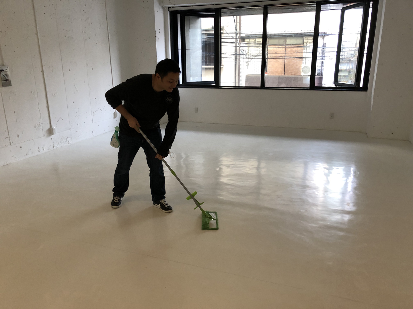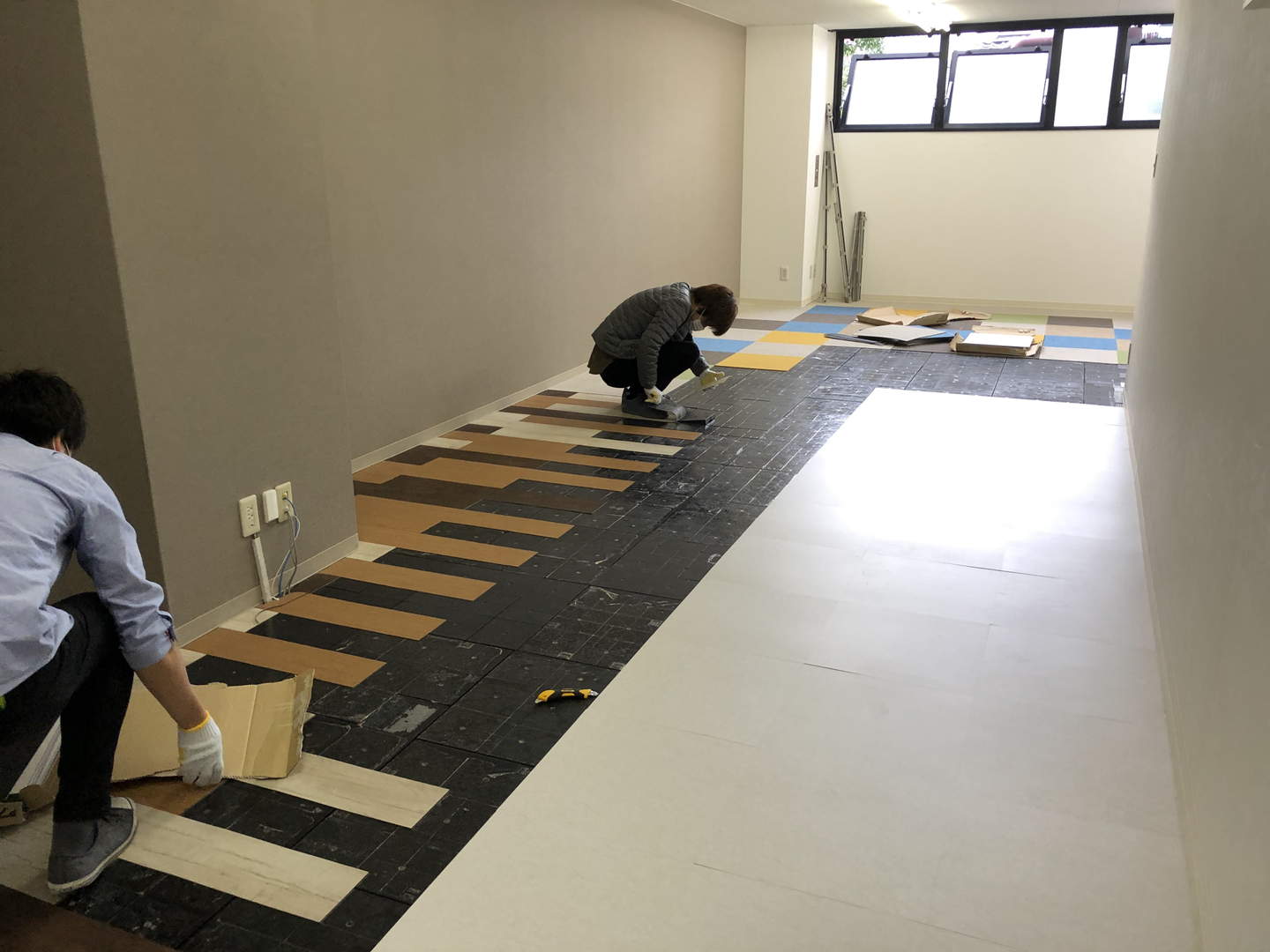 床にタイルを貼っています。貼り換えたタイルの幅がぴったりだったことには全員感動しました!(笑)