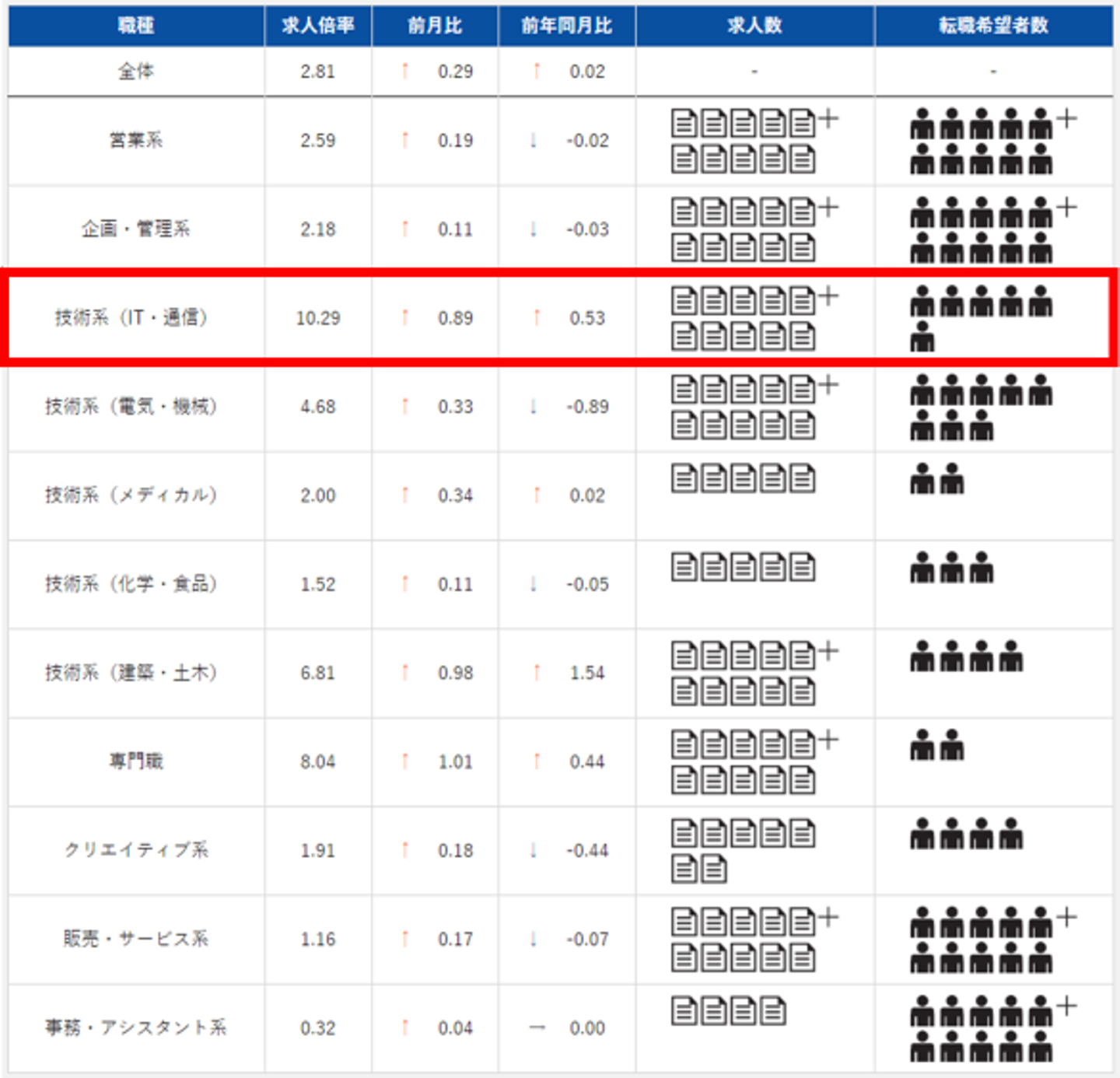 エンジニア採用というと、一般的に馴染みの薄いスキルセット(プログラミング言語など)の採用要件に対して「他のポジションと違って難しい…」と感じる人事担当者の方も多いのですが、それ以上に今、エンジニア採用が難しい理由は単純に「需給バランスが崩れている」ことが最大の理由かと思います。以下のdoda(パーソルキャリア)の調査データからも、ITエンジニアが飛び抜けて人材不足で、1人のエンジニアを10社で奪い合っている状況だということがわかります。