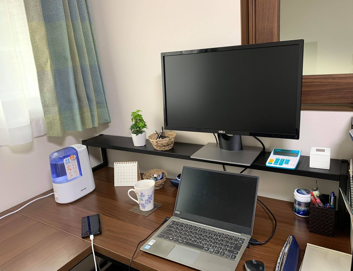 「PCスタンドを置き、ちょうど良い目線の高さに。座り心地の良い椅子とストレッチクッションで、身体が疲れにくいようにしています。また、カレンダーを配置しているので、すぐに日程確認できますね」