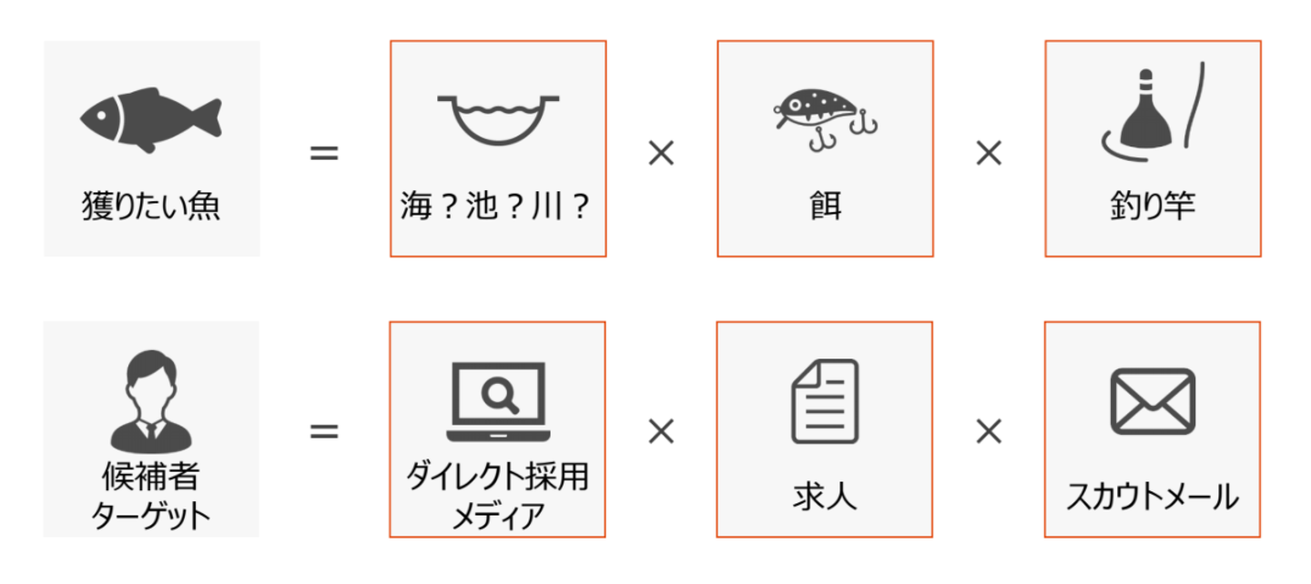 ダイレクト採用は「釣り」と似ています。どのような場所で何を使ってターゲットにアプローチするのか、一つひとつ考えていく必要があります。