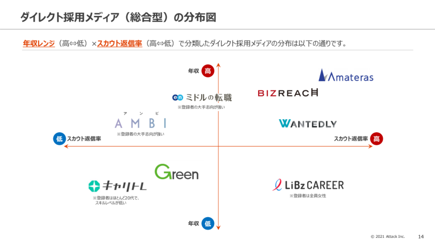 各ダイレクト採用メディアの分布図です。メディアによってスカウト返信率や候補者の特徴に大きな違いがあります。中でもWantedlyとビズリーチ、Greenは登録者数が多く、3大ダイレクト採用メディアと言えます。まずはこれらを活用すると良いでしょう。