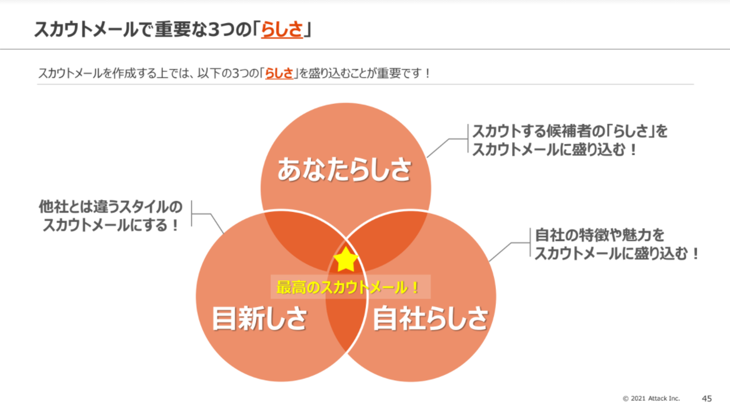 スカウト活用においては、重要な3つの「らしさ」があります。1つ目は、候補者の「あなたらしさ」。候補者の経験やスキル、キャリアビジョンなどに目を通した上でスカウトメールを作成し、候補者をスカウトした理由を具体的に伝えましょう。2つ目は、「自社らしさ」。ありふれた企業の魅力に留まらず、自社の事業や業務環境、組織の特徴などを具体的に記載します。3つ目は、「目新しさ」。スカウトメールの件名や求人のタイトルに、あまり見かけないキーワードを盛り込むと、多くの候補者に見てもらえることもあります。