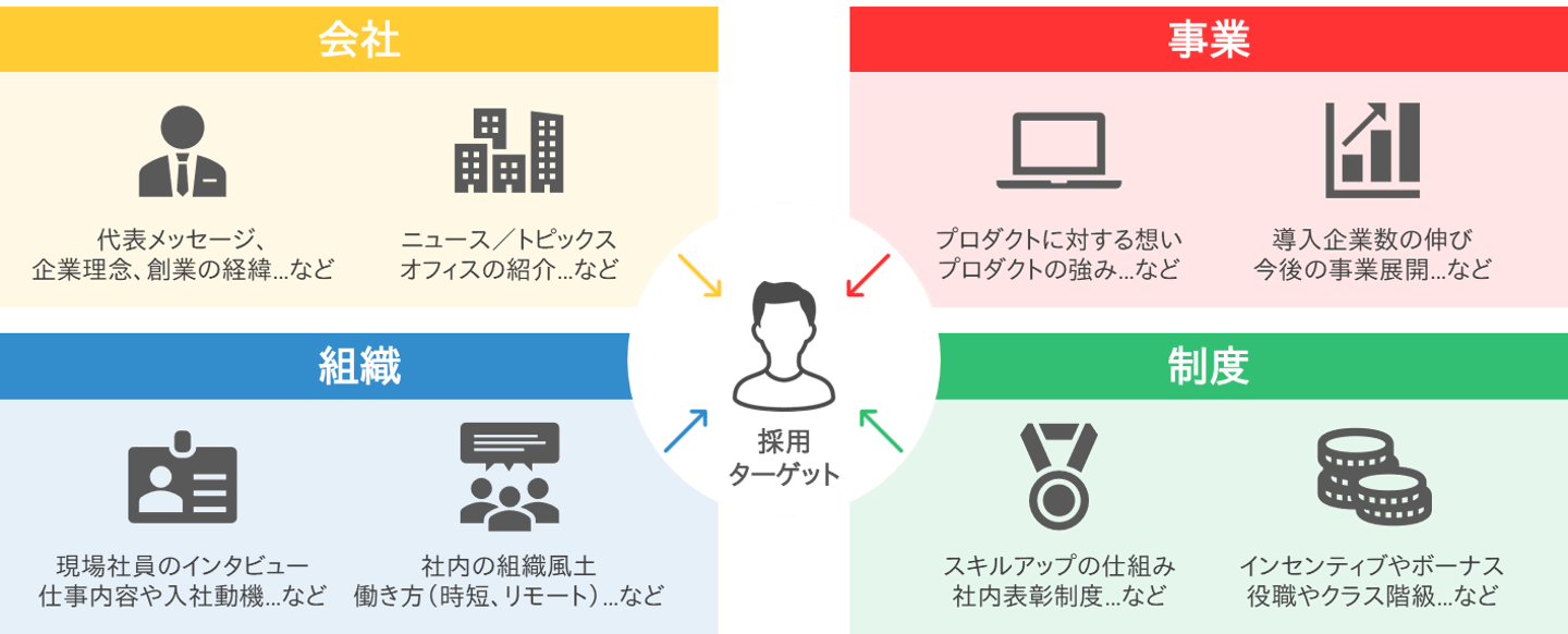 具体的な採用広報コンテンツを考える前に、まず「会社が従業員に提供している要素」のうち、採用広報で何を重視すべきかを整理する必要があります。パッと思いつくのは給与や福利厚生の充実度、会社の知名度や規模、福利厚生の充実度などかもしれませんが、スタートアップ/ベンチャー企業や中小企業にとって、これらの要素は大手企業に太刀打ちできないことが多いかと思います。