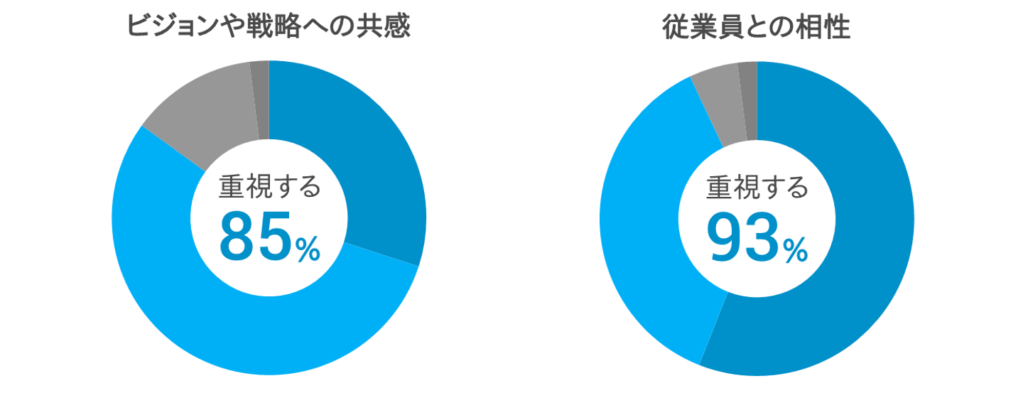 現在、ビジョンへの共感や従業員との相性を重視する求職者が増えています。特にスタートアップ/ベンチャー企業へ転職を考える求職者の中では、その傾向が顕著かと思います。少し古いですが、以下はビズリーチ利用者に対するアンケート結果です。