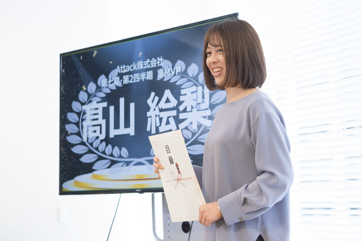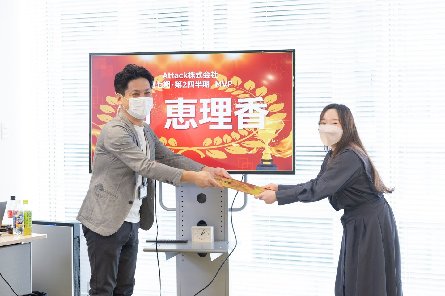社内MVP、通称「Attack No.1」は、2022年1月から3月までの第2四半期において、価値発揮、組織貢献したと思うメンバーを社内投票によって選出。選出対象者は役員やマネージャー以外の正社員、契約社員、アルバイト全員です。