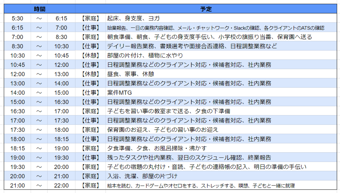 5時半に起床して身支度を済ませ、約20分ヨガで呼吸を整えたり体をほぐしたりしてから始業し、その日のタスクの確認、前日終業後に受信したメールやチャットへの返信をします。子どもの起床時間に離席して朝食や朝の送迎など家事を済ませて、8時半から本格的に業務開始です。