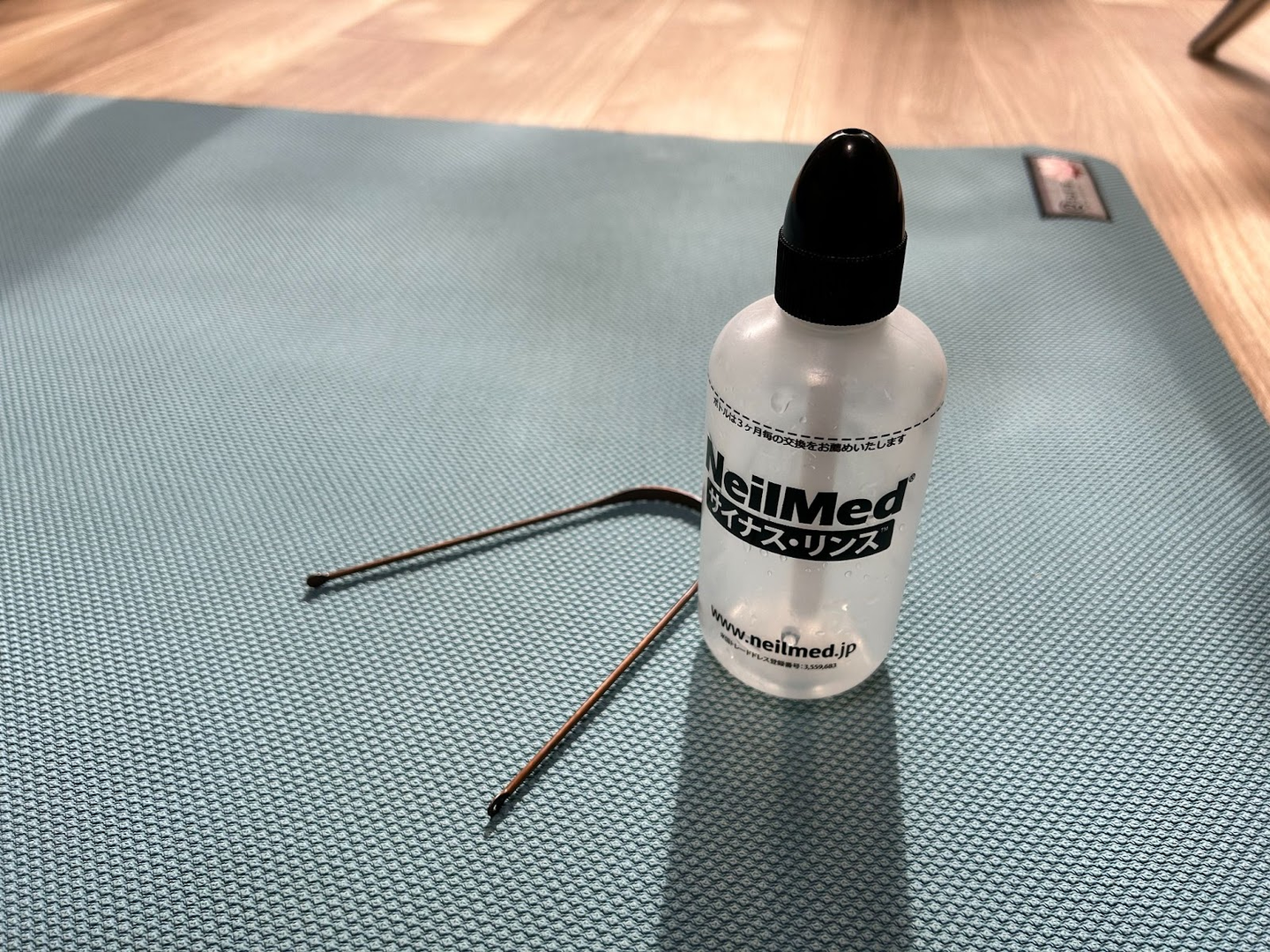 ▲ヨガマットの上にあるのは、タングスクレーパー(舌磨き)の道具と鼻うがい用のキット