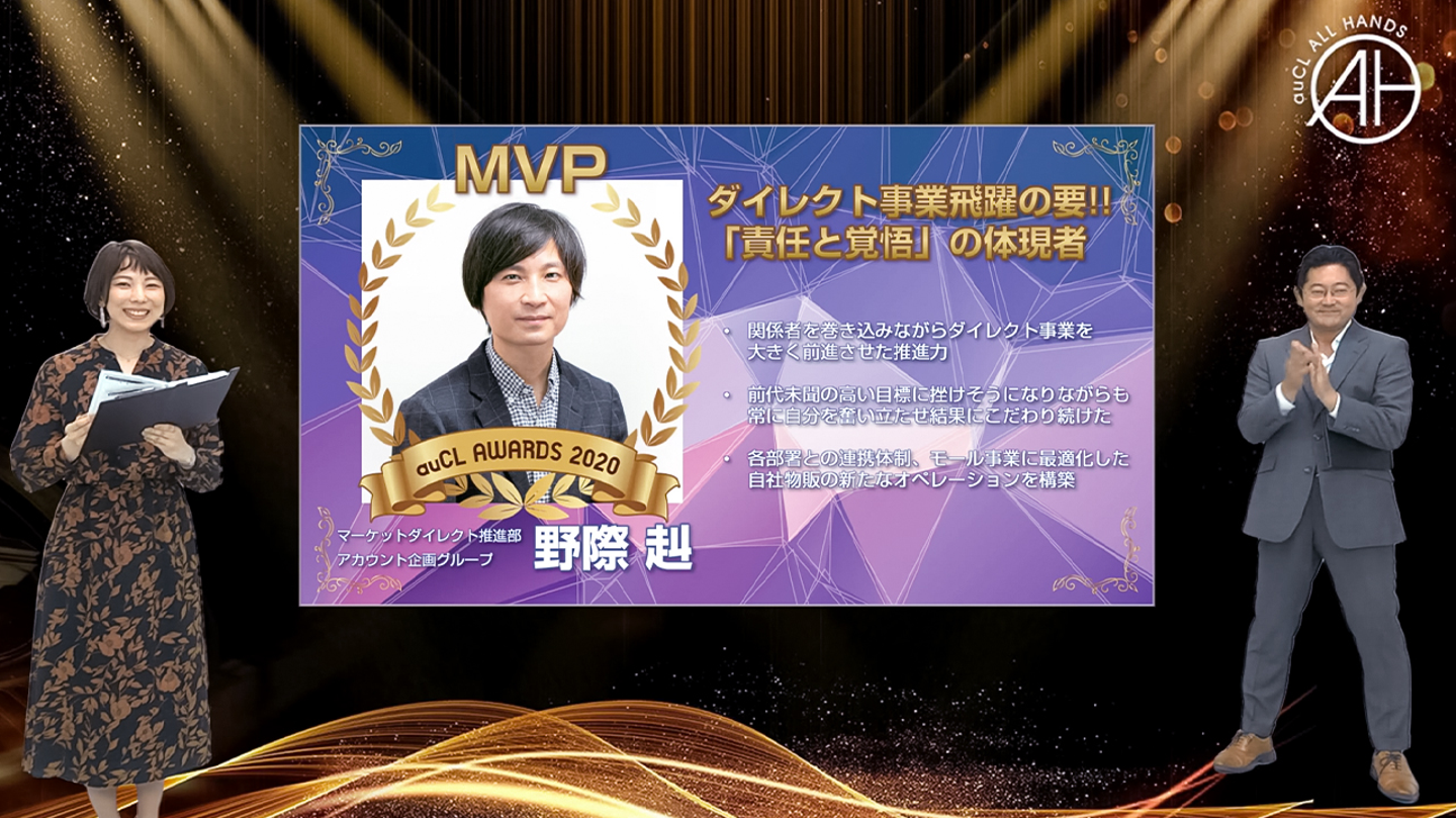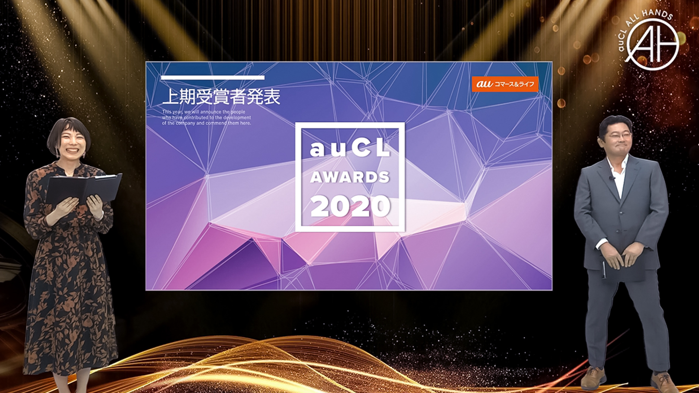 後半からは雰囲気をガラリと変えて『auCL AWARDS 2020』と評して、上期アワード受賞者の表彰式が行われました!auCLでは半期ごとに、さまざまな領域で活躍したメンバーを表彰する文化があります。上期・下期の終了時期に、会社全体で相互投票の末、アワード受賞者が選出されます。