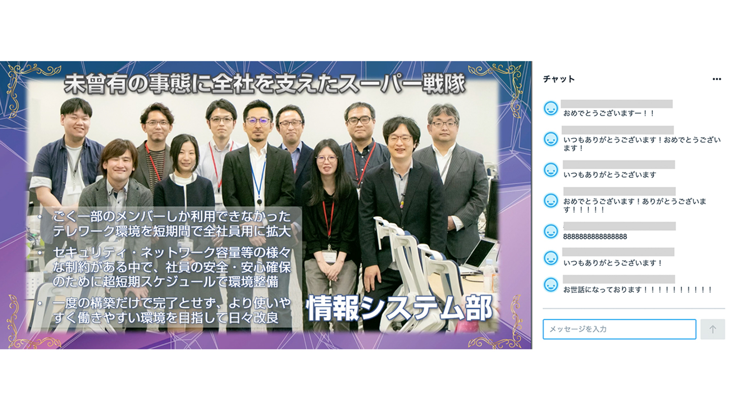 また、今回の表彰式中はチャット機能が解放され、受賞者に向けてお祝いの言葉や、日頃の感謝を伝えるコメントが続々投稿されていました。オンラインでの開催で、社員同士顔を合わせることは叶いませんでしたが、離れていてもお互いの存在を感じ合えるような一体感が生まれていました!他の参加者が感じてていることがリアルタイムに見える化されるのはオンラインイベントだからこそメリットだと感じました。