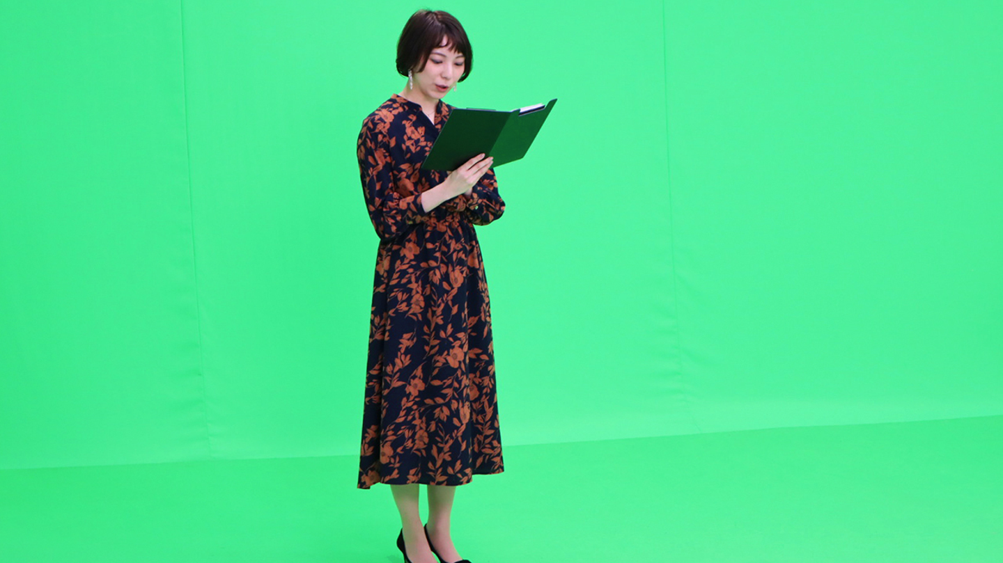 撮影の裏側。グリーンバックを背景に司会を担当いただいたのはライフスタイル営業部営業企画Gの羽賀麻由佳さん。ありがとうございました!