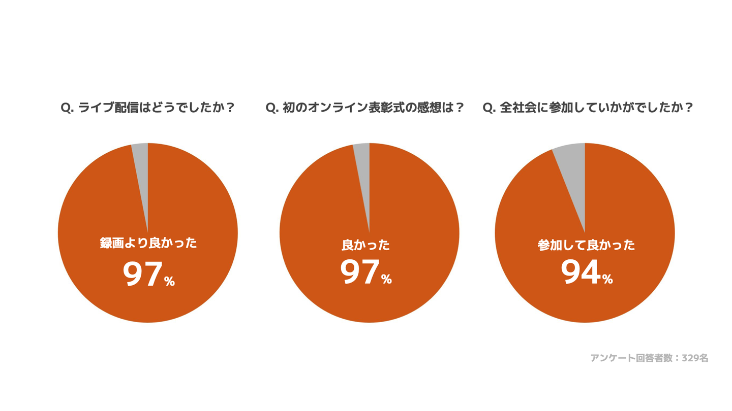 「今後も全社会をリモートで行って欲しいです!」「物理的に疲れずに内容に集中できるので、ぜひオンライン開催を続けて欲しい。」「ドキドキ感とチャット機能も合間ってみんなが一緒に楽しんでいる感じが見えてとてもよかったです」など、ライブ配信を支持する意見が多く寄せられました。