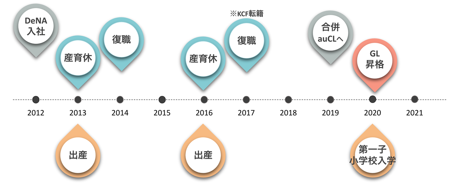 植田さんは2012年にDeNA入社、2013年と2016年にお子様をご出産、第2子の育休復職時にKCFへ転籍、合併を経てauCL2年目となる2020年4月にグループリーダー(=以下GL)に昇格されました。植田さんはライフスタイルの変化はありつつキャリアのスピードも緩めないという印象を受けますがいかがでしょうか?