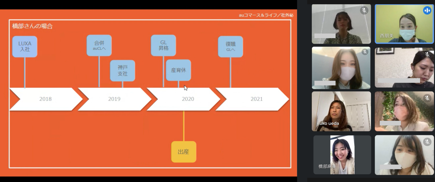 第1回目のテーマは『ライフステージの変化とマネジメント職の両立』です。 2020年にauCL社内でアンケートを取った結果、女性社員が管理職になりたくない理由トップ1は「プライベートがおろそかになりそう」という回答で多くの方が両立への不安を感じていることが分かりました。そこで育児真っ最中の女性GLお二人を招き、新卒社員を中心とした9名の女性社員と一緒に、仕事と家庭の両立やキャリア形成についてお話を伺いました。