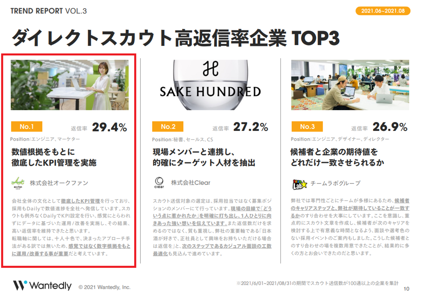 株式会社オークファン人事担当の荒井です。なんとこの度、Wantedlyが毎Q発表しているトレンドレポートにおいて、株式会社オークファンが、ダイレクトスカウト高返信率企業No1を獲得しました!!