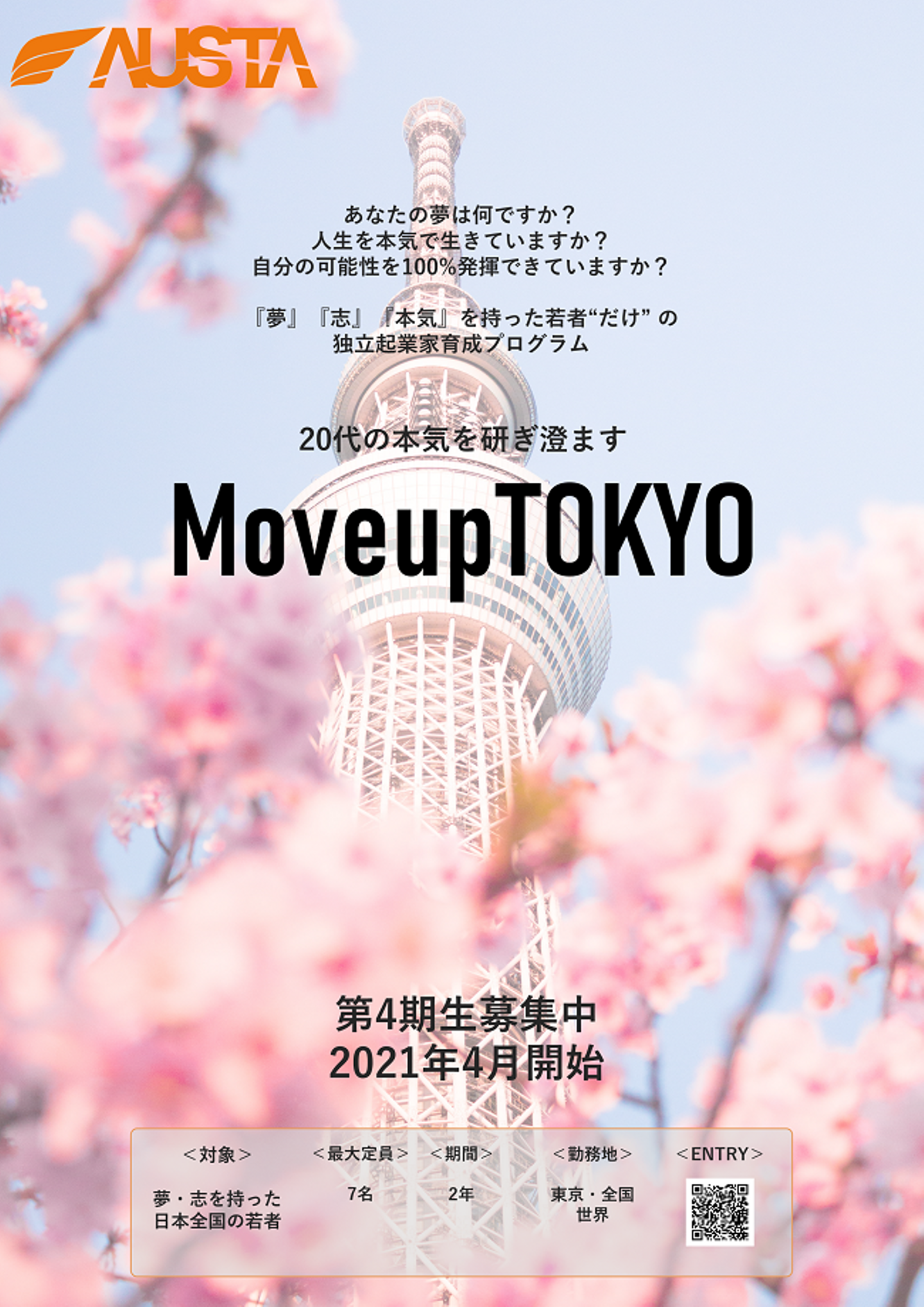 ただいま弊社アウスタでは、2021年4月より始まる20代起業家事業家育成プログラムMoveupTOKYOの第4期生を募集中です。