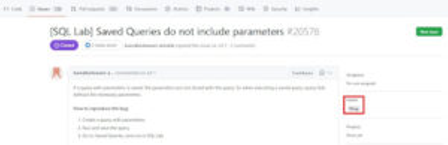 実際にバグが修正された例を見てみましょう。レビュワーの一人がバグを発見したため”[SQL Lab] Saved Queries do not include parameters“というIssueを作成し、バグを報告します。 この場合、Saved Queriesという機能が動いていないという報告ですね。ここには、バグの再現方法やバグ発生時の環境を報告し、コメントでほかの人も同じバグが確認できたことなどを共有しています。また、スクリーンショット等も使って、わかりやすく開発者間で情報を共有します。
