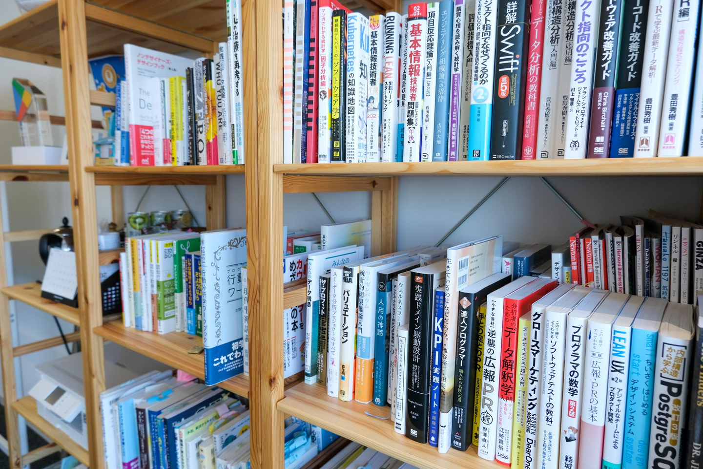 学習のための書籍は気軽に購入の相談ができ、オフィスの本棚には、エンジニアリングやデザインの技術書はもちろん、認知行動療法などの心理療法、行動分析学などに関する書籍も豊富に揃えています。
