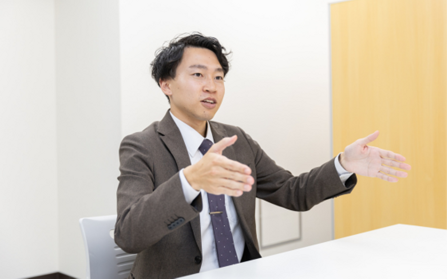 続きましてこちら、引地さんのインタビュー写真。ばっちり決まってますが、家の間取りを説明している手振りなんです。キマりすぎていて面白いですね。真剣に家の間取りを説明しています。笑