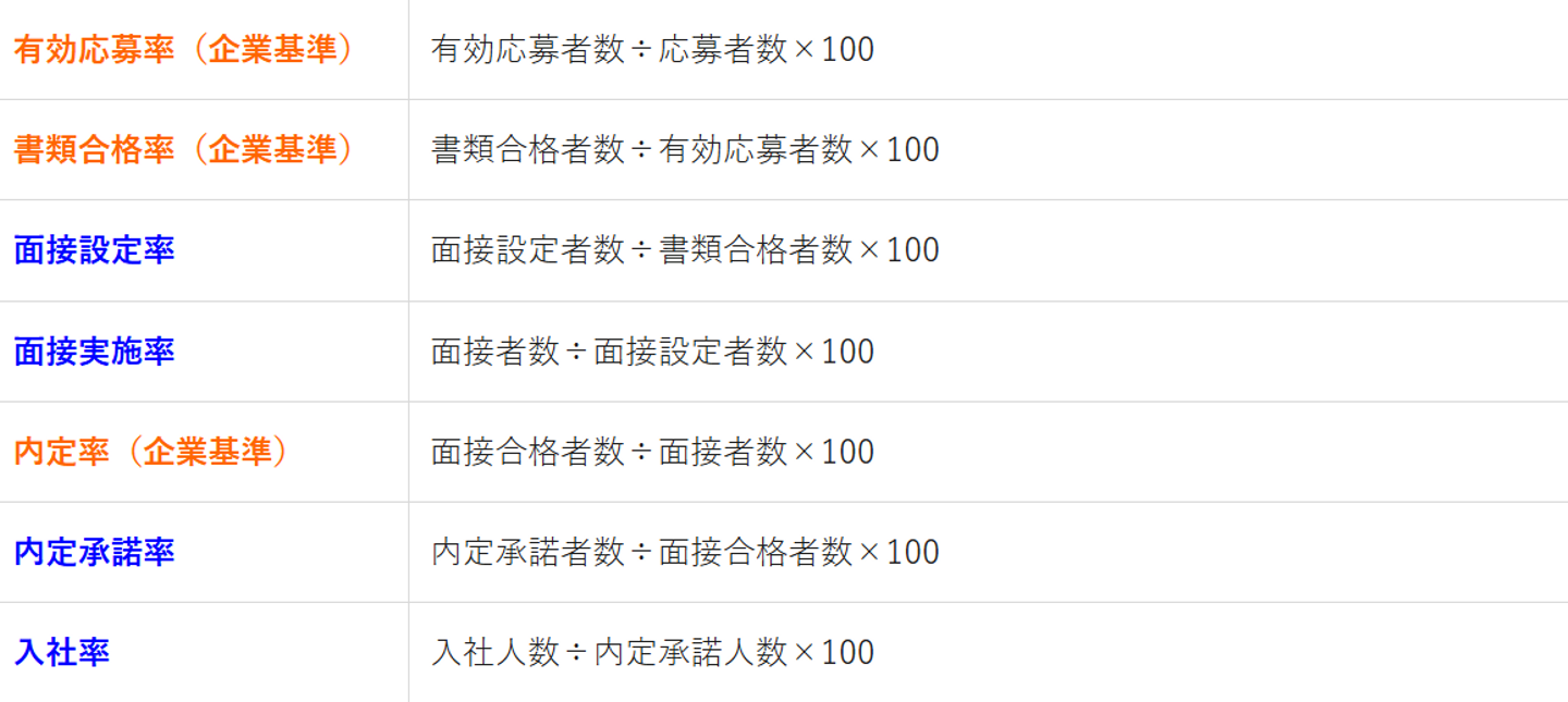 青字の目標「面接設定率」「面接実施率」「内定承諾率」「入社率」歩留まり率は以下で詳しく解説しています。