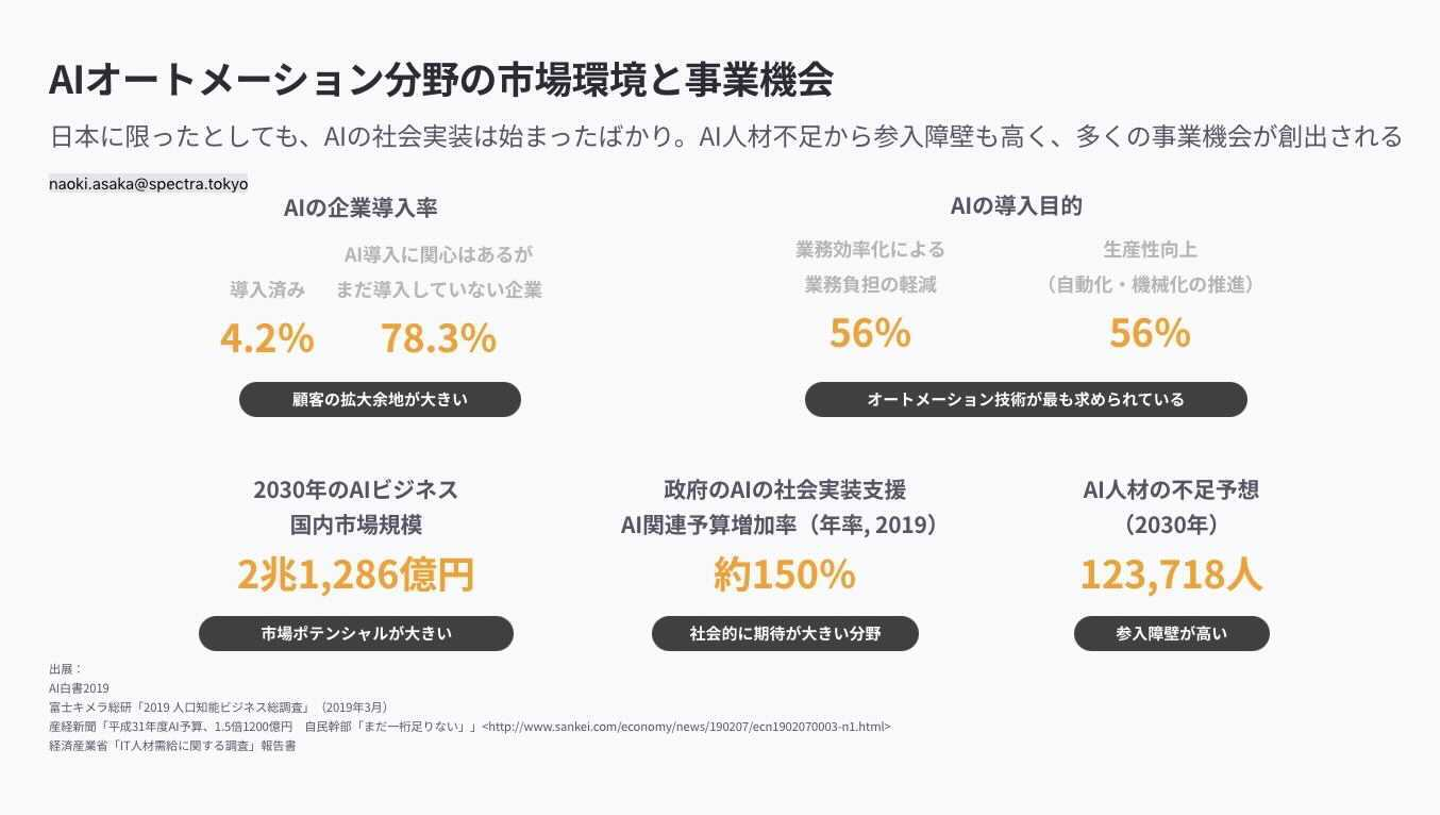 今後労働人口が大きく減少する中で、AI オートメーションによって私たち人間が持つ能力や可能性を飛躍的に拡張することで生産性、仕事量を向上させることができるような、日本発で世界中に顧客基盤を持つスタートアップを目指します。