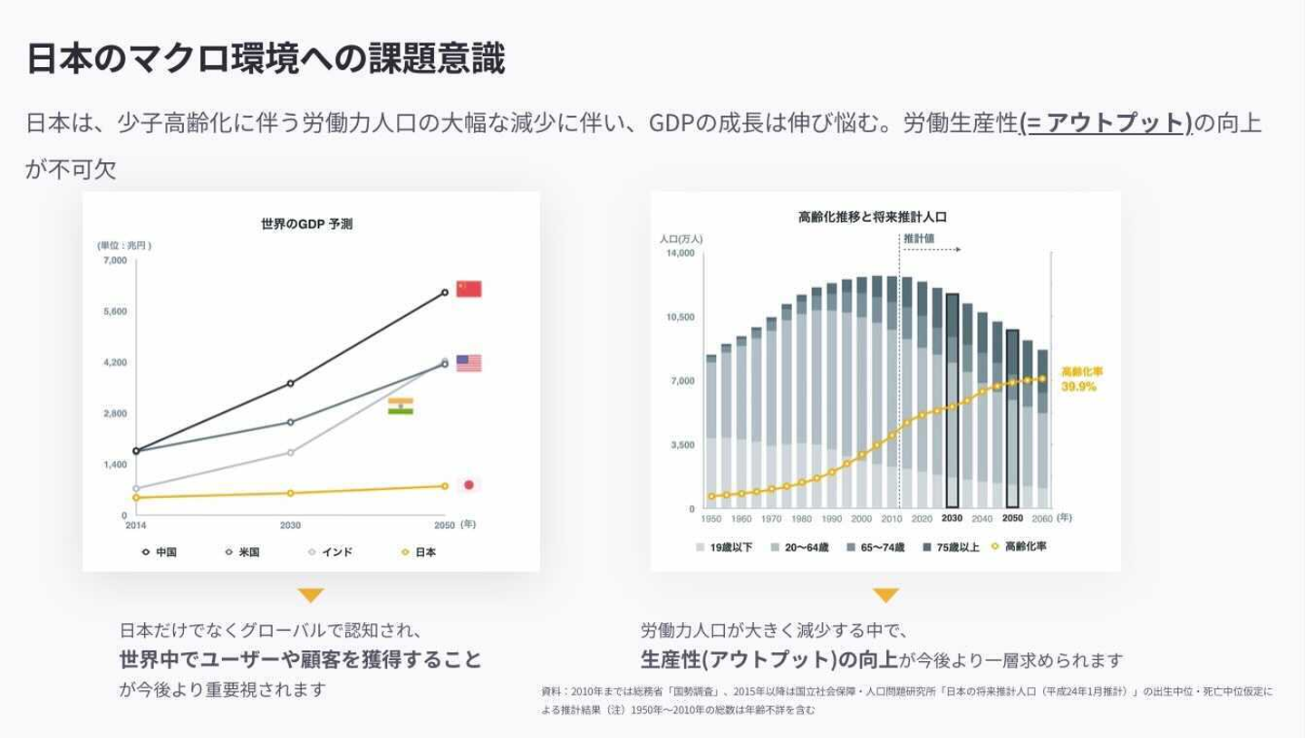 日本にとって大きな社会的な課題は、「GDP成長率が伸び悩み、さらに少子高齢化に伴い将来的に日本国内の内需は大きく縮小すること」です。このような社会的な課題を解決するために、ロングタームで本当に価値がある事業の創出を行ってまいります。