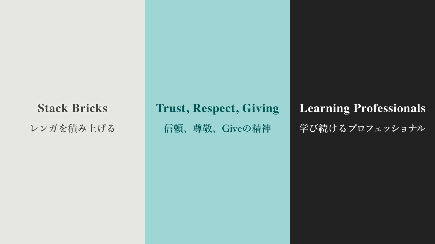 “Trust, Respect, Giving”=“信頼、尊敬、Giveの精神”