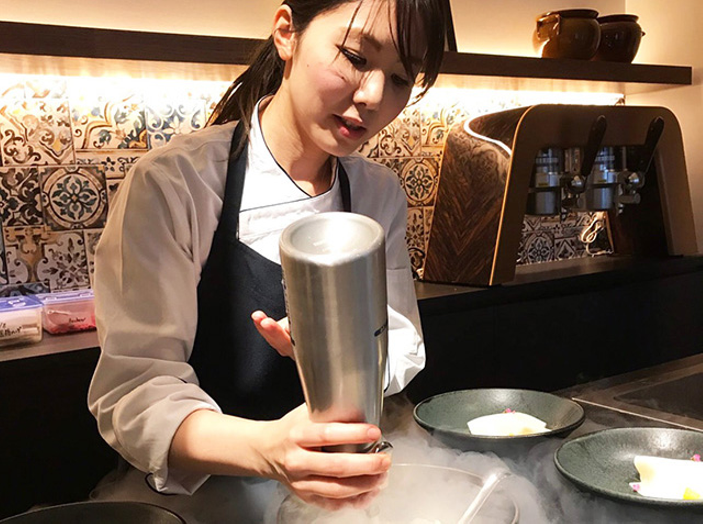 アシェットデセールはお客様の目の前で完成させることが多いデザートです。液体窒素を使ったり、香りをプラスしたり。たった今目の前でできあがるデザート。それがアシェットデセール。