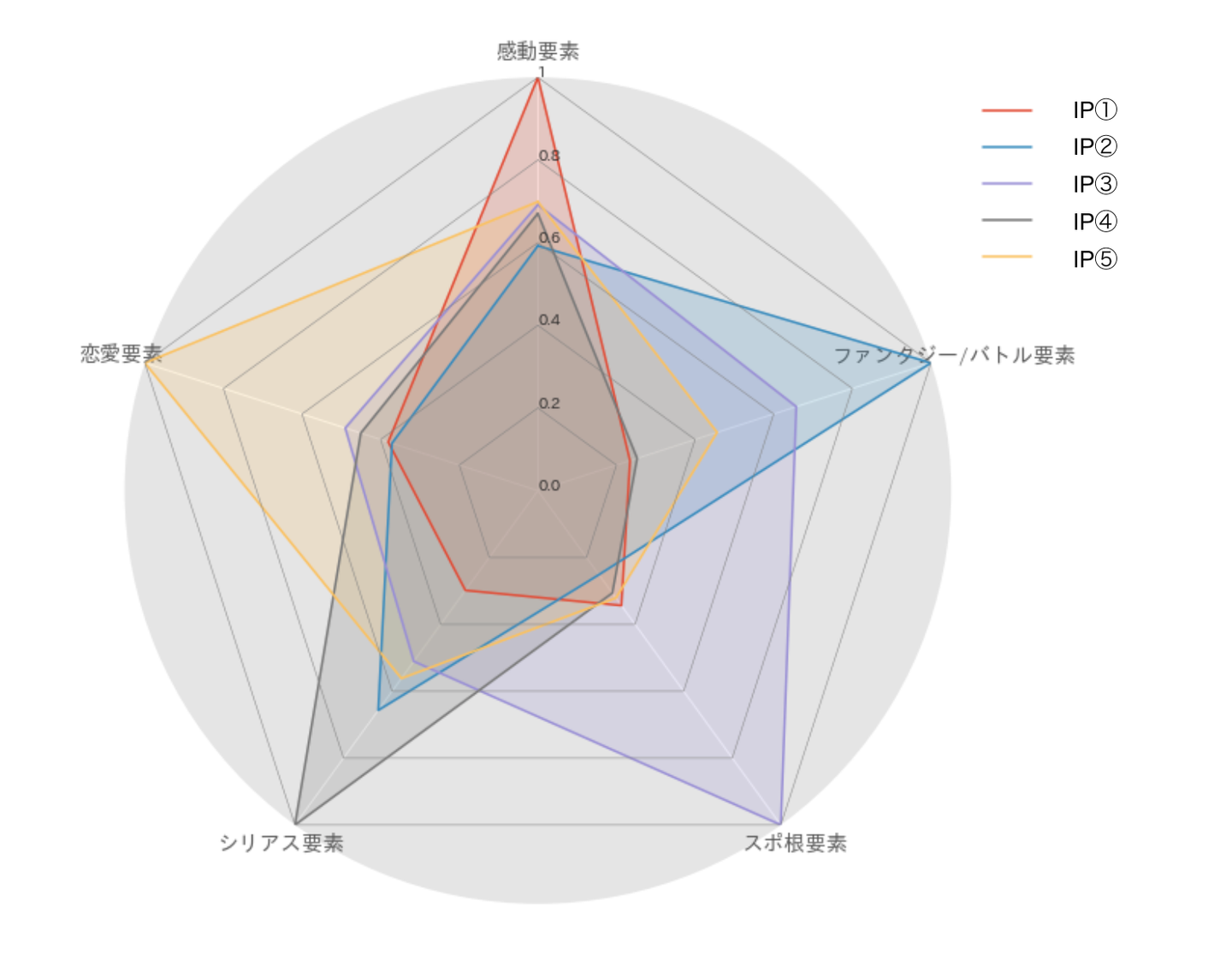 また作品が持つ属性の強弱を上手く表現するために、前述の5つの作品傾向のスコアを以下のような形で抽出しました。