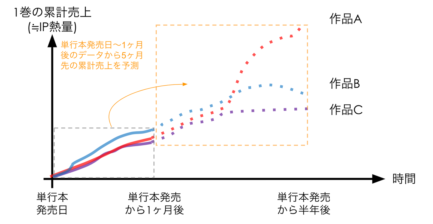具体的には、「IP熱量 = 単行本1巻の累計売上」と定義し、単行本1巻発売日から1ヶ月間のデータを用いてその後の売上を予測する問題として設定しました。