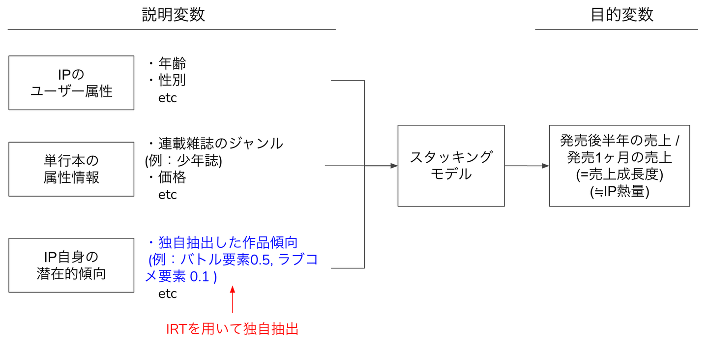 説明変数としては、「IP自身の属性情報」と「IPのユーザー属性情報」と「単行本の属性情報」を利用しています。