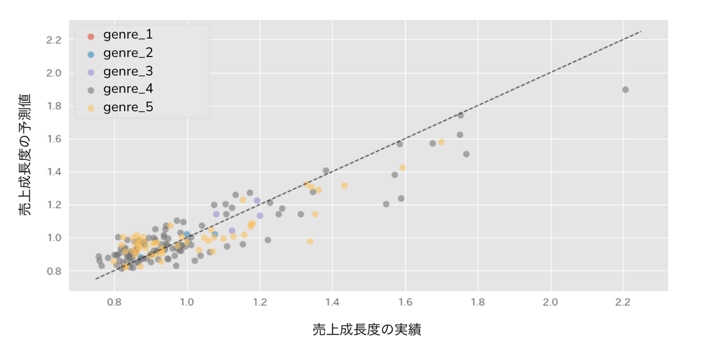 各IP毎の売上成長度実績と売上成長度予測値を比較した図が以下になります。