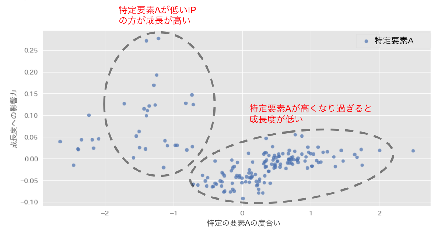 横軸にIPの特定要素Aの度合い、縦軸に売上成長度への影響度をplotした図が以下になります。