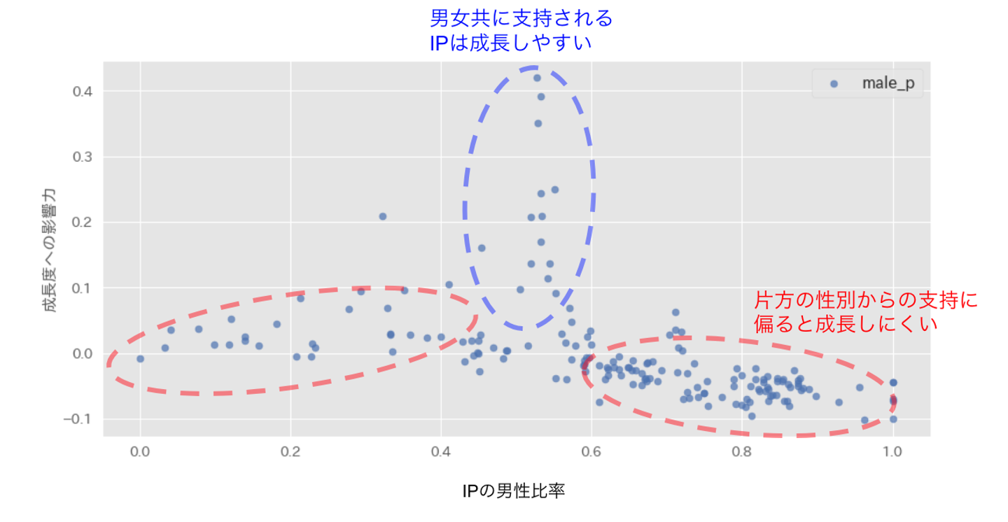 横軸にそのIPのファンの男性比率、縦軸に売上成長度への影響度をplotした図が以下になります。