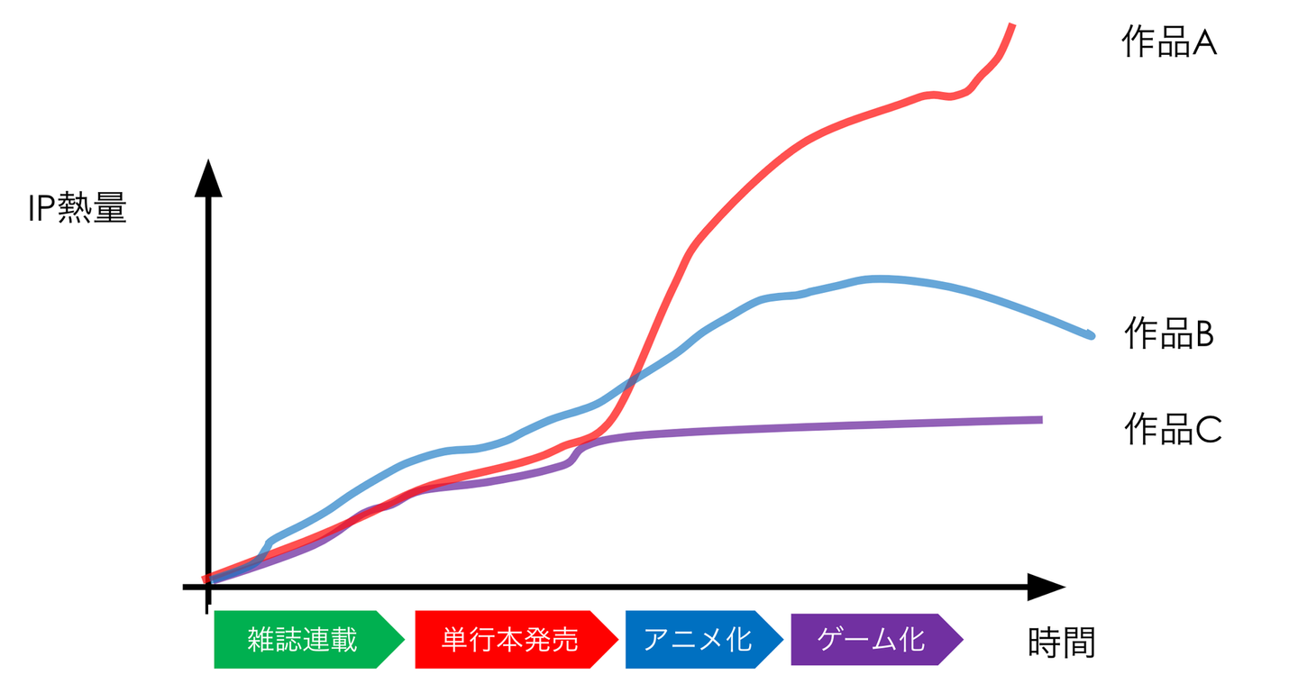 一方で上記の成長パターンを経ても、下記図のように作品によってIP熱量は異なります。
