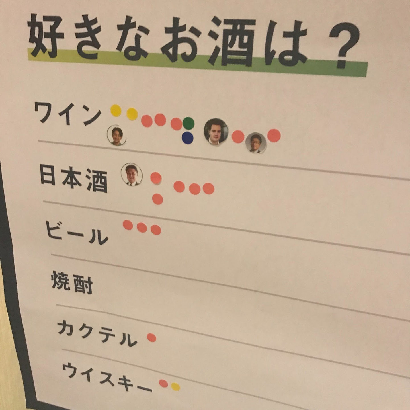Q週末よく行くところは?Q気になるデジタルサービスは?等、のお題に自由に回答していきます。意外な共通点が発見できて会話が盛り上がりました。好きなお酒はワインが断トツで人気なようですね。