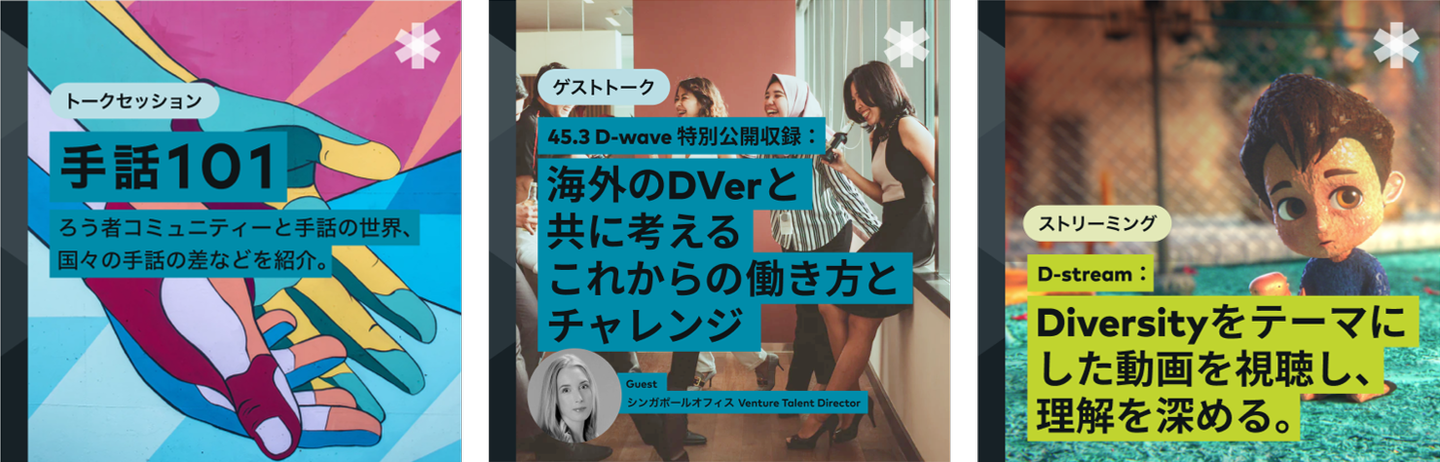 イベントは、外部や海外オフィスからのゲストを招いたトークセッション、パネルディスカッション、手話レッスン、D&Iに関連したショートフィルムを見ながらChatで感想をシェアしあう”D-Stream”と題したセッションなど、一方通行にならず、飽きさせない内容ばかりです。