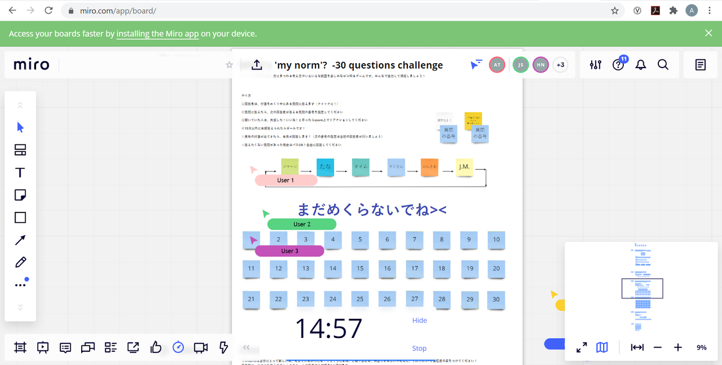 職種も社歴も様々な5~6人ずつのチームに分かれ、Miro(オンラインホワイトボードツール)上で、「好きな食べ物は?」「DVに入って驚いたことは?」「働くうえで一番大事にしていることは何?」「自分にとっての理想のチームとは?」等々の質問に、ボード上のポストイットをめくりながら答えていきます。