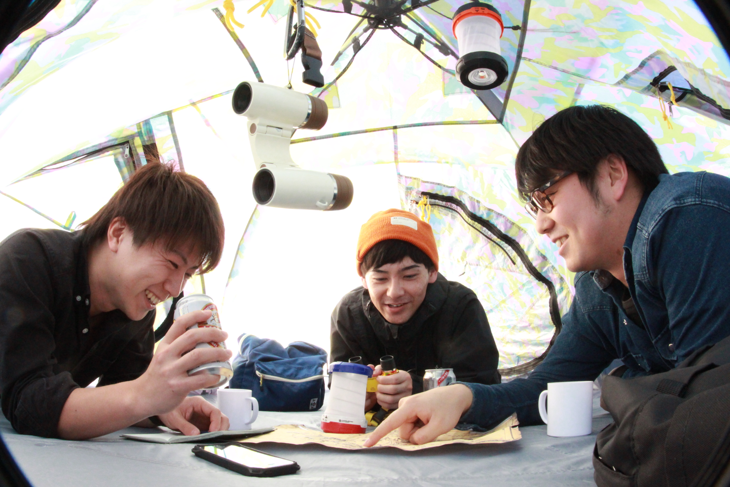 軽いパニックになりましたが、突撃取材の方の目に最初にとまったのが、緒方が開発した「ほしぞらテント」でした。