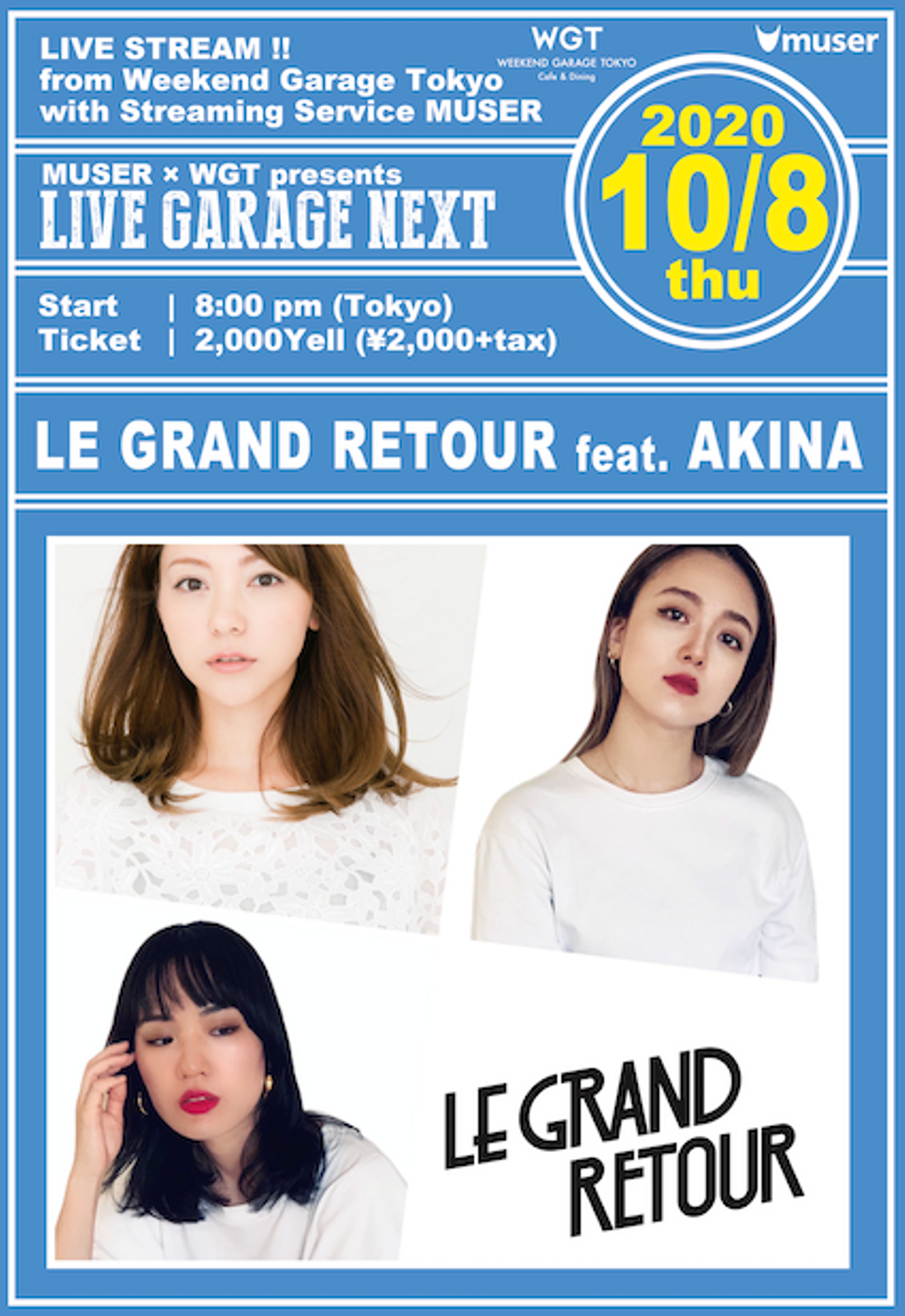 また、中園さんがメンバーとして活躍する「LE GRAND RETOUR」は10月8日は代官山のWGTからMUSERを使ったライブ配信を行います!スペシャルゲストに歌手の「AKINA」さんをお招きするスペシャルなイベントです。中園さんと竹田さんの奏でる演奏とAKINAさんの歌声のハーモニーは必聴です!!是非ご参加ください!!