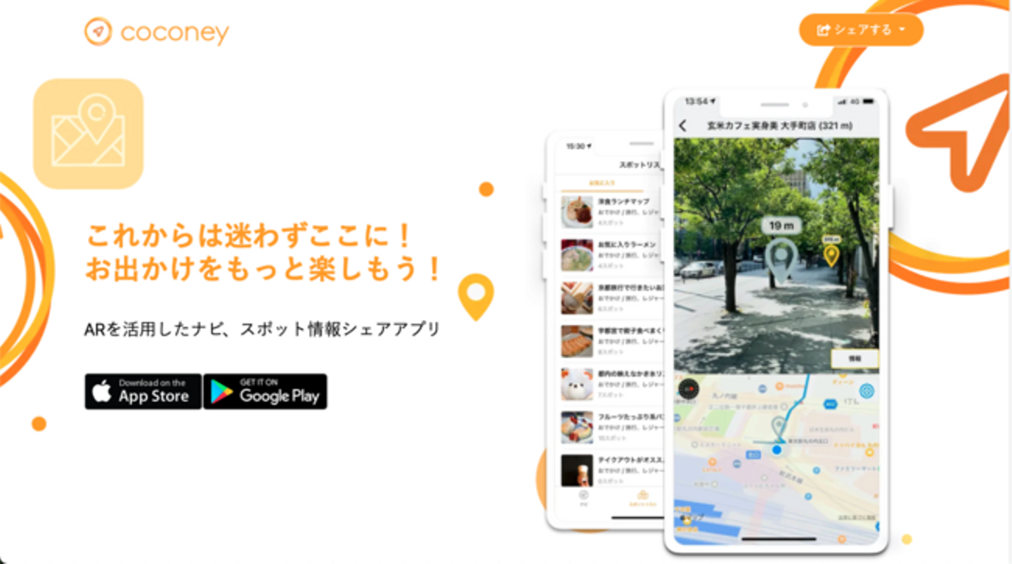『coconey(ココニー)』は、ARナビ×スポット情報のシェアから生まれる新たな移動体験で、お出かけをもっと楽しくするサービスです。