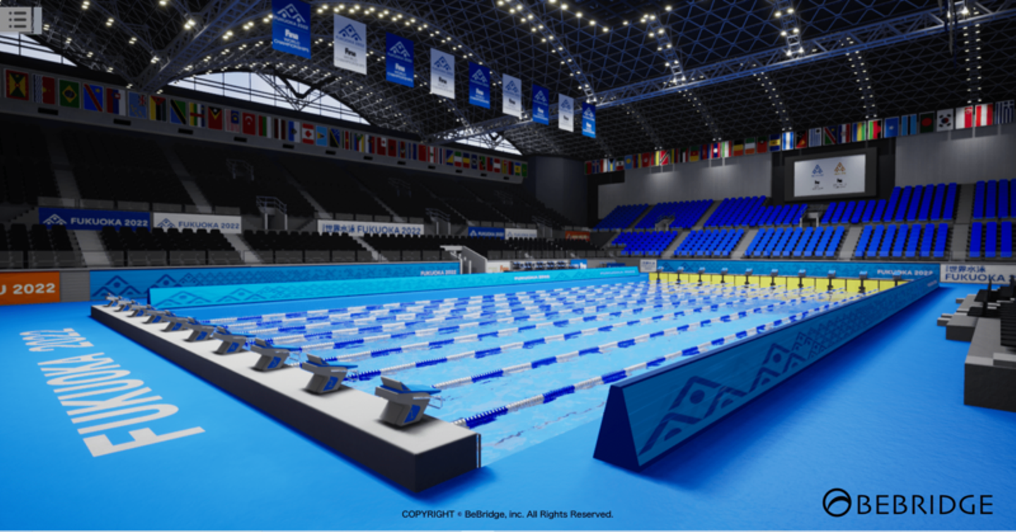 今回は世界水泳選手権大会のメイン会場を、弊社の持つ高クオリティなVR技術で再現しました。本来、大会期間のみ楽しめる会場ですが、最新のVR技術を使って実空間さながらの会場を再現することで、大会開催前から臨場感ある会場の雰囲気を体験いただけます。