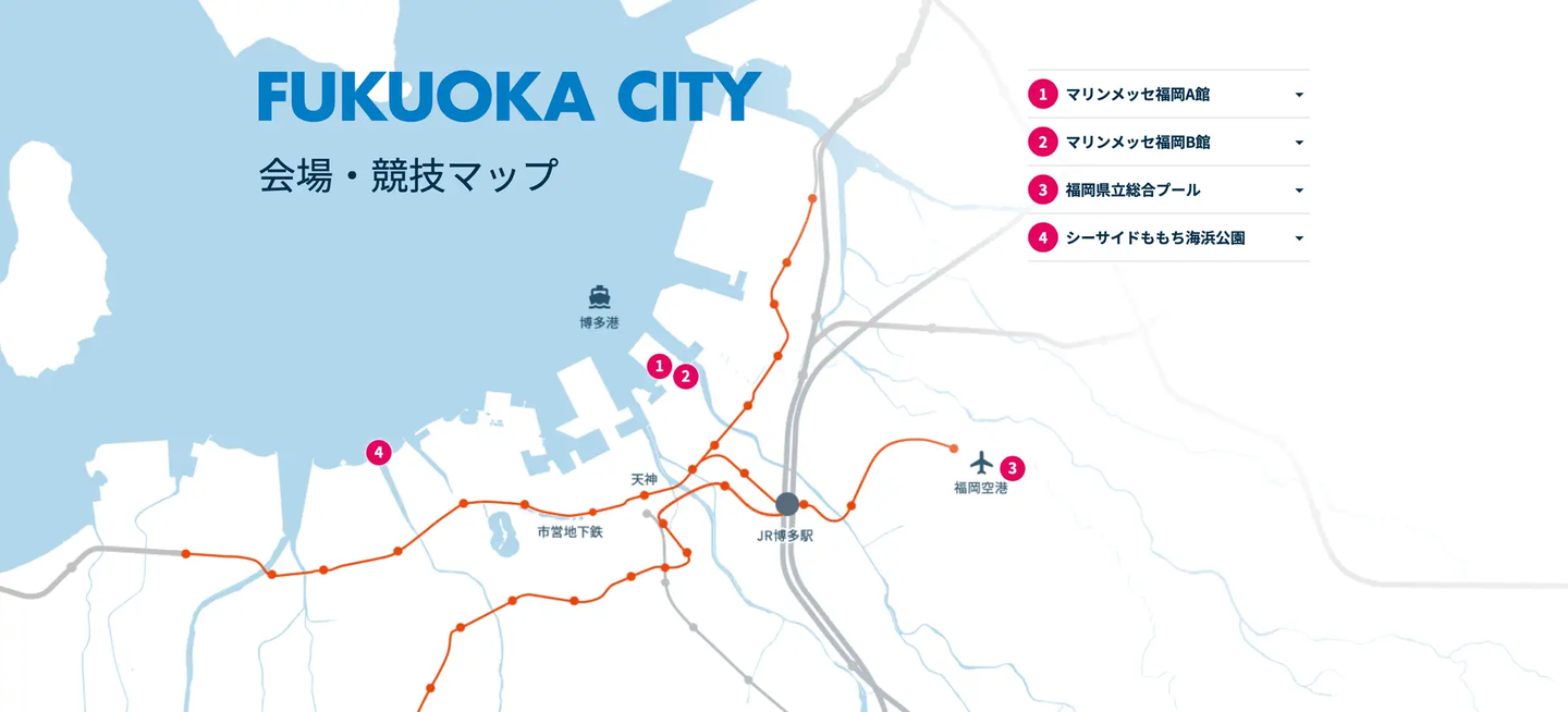 ①マリンメッセ福岡A館(競泳、アーティスティックスイミング)
